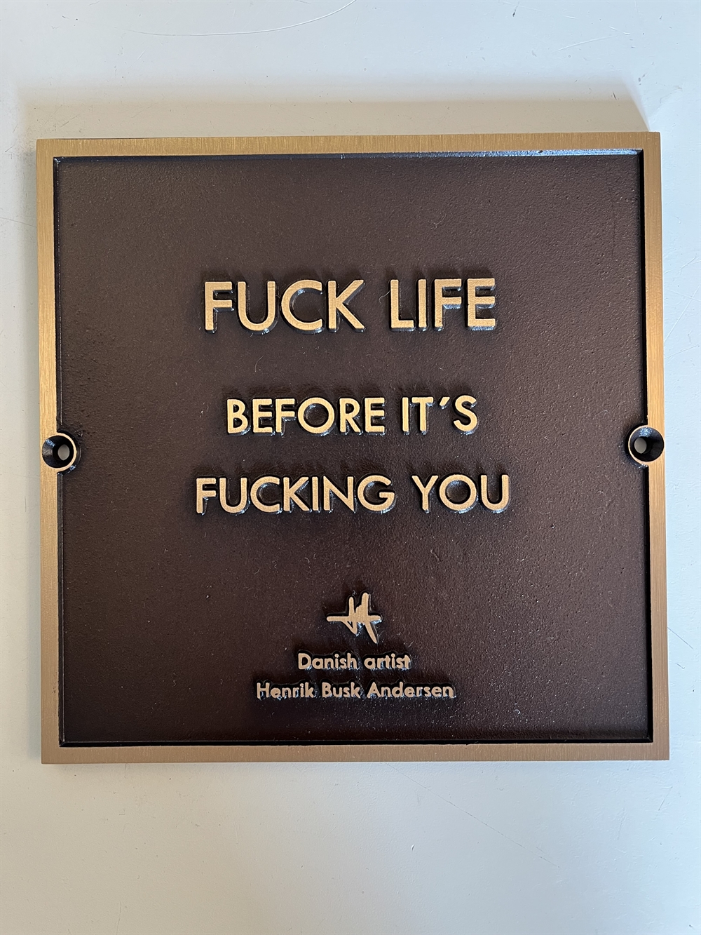Bronzeplade af Henrik Busk Andersen. Matchende skruer til ophængning medfølger.