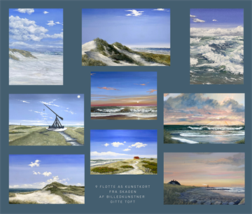 Malerierne er malet af Billedkunstner Gitte Toft. Kortets størrelse A5 og med ramme A4. Kan med fordel sættes sammen 2 og 2.