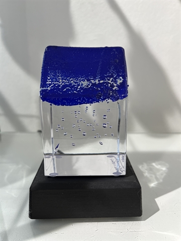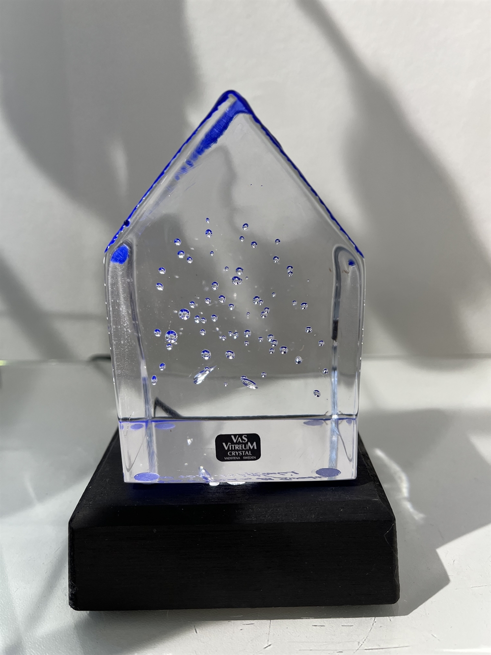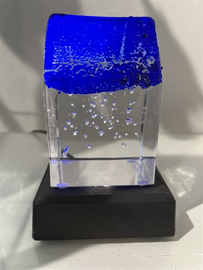 Massivt glashus med flotte luftbobler. Huset står på en træ sokkel med lys i. Soklen følge med. Af Mikael Kenlind