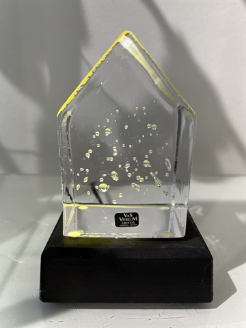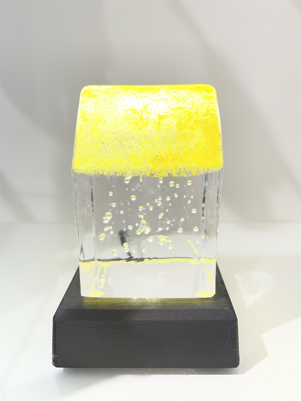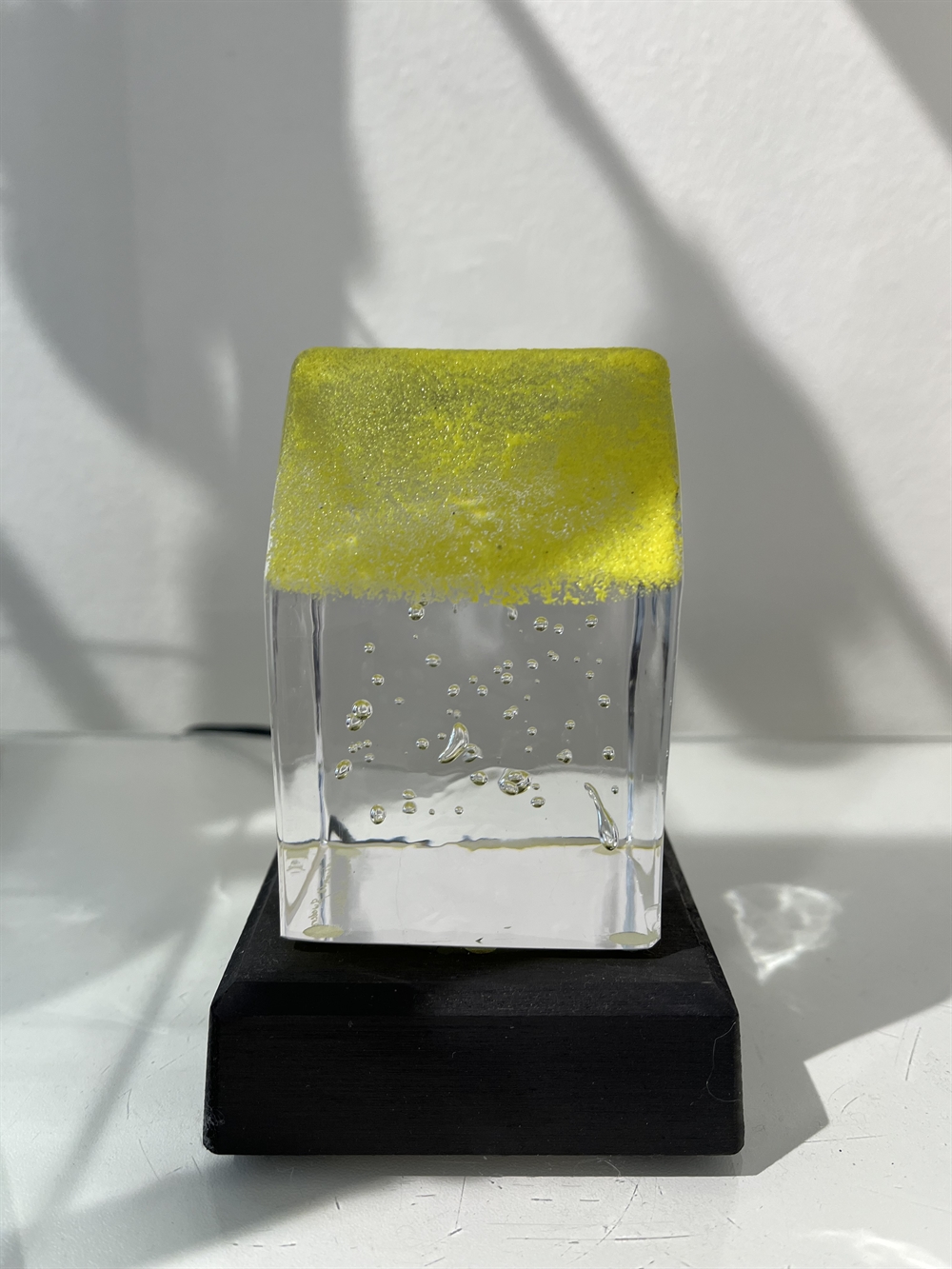 Massivt glashus med flotte luftbobler. Huset står på en træ sokkel med lys i. Soklen følge med. Af Mikael Kenlind