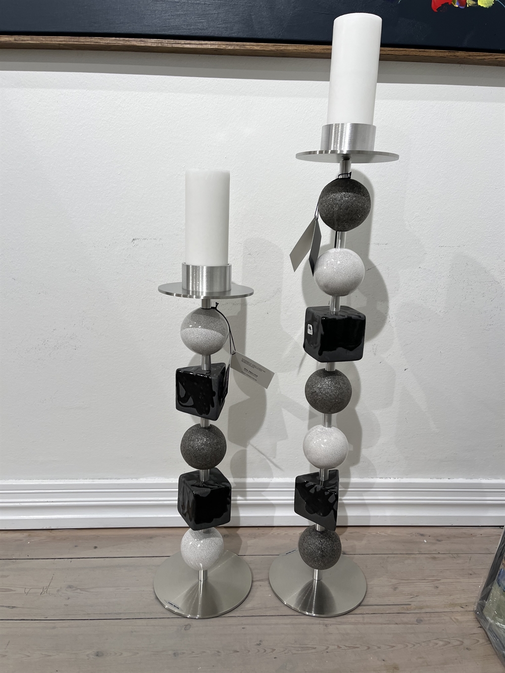 Lysestager med håndlavede kugler i keramik. Kuglerne sidder på en stage af stål.