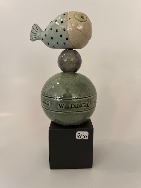 Skøn søjle på grå træfod med en hval. Af Christina Weldingh