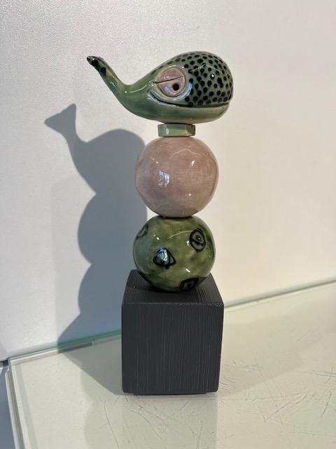 Skøn søjle på grå træfod med en hval. Af Christina Weldingh