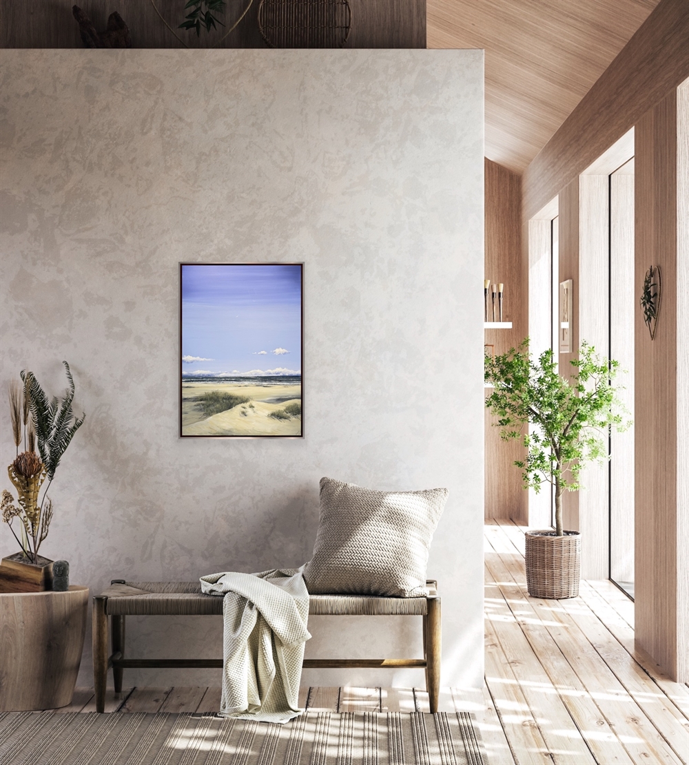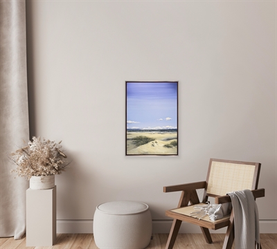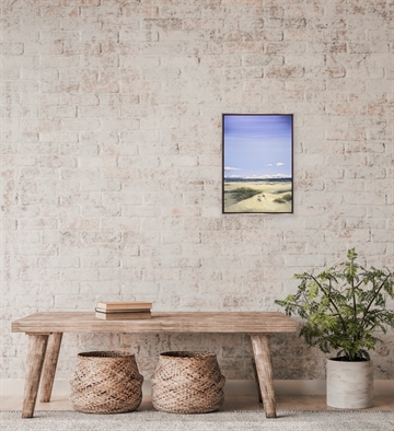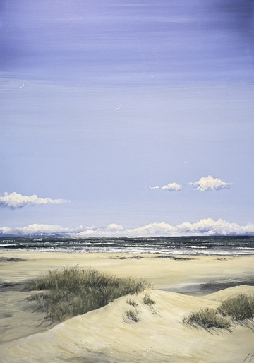 Oppe fra klitternes bløde toppe i Gl. Skagen, åbner der sig en storslået udsigt ud over havet. Det varme lys kærtegner sand og marehalm, mens horisonten smelter sammen i blide, blå og grønne toner toner. Motivet indfanger følelsen af frihed og vind i håret, her taler naturen sit eget tavse sprog.