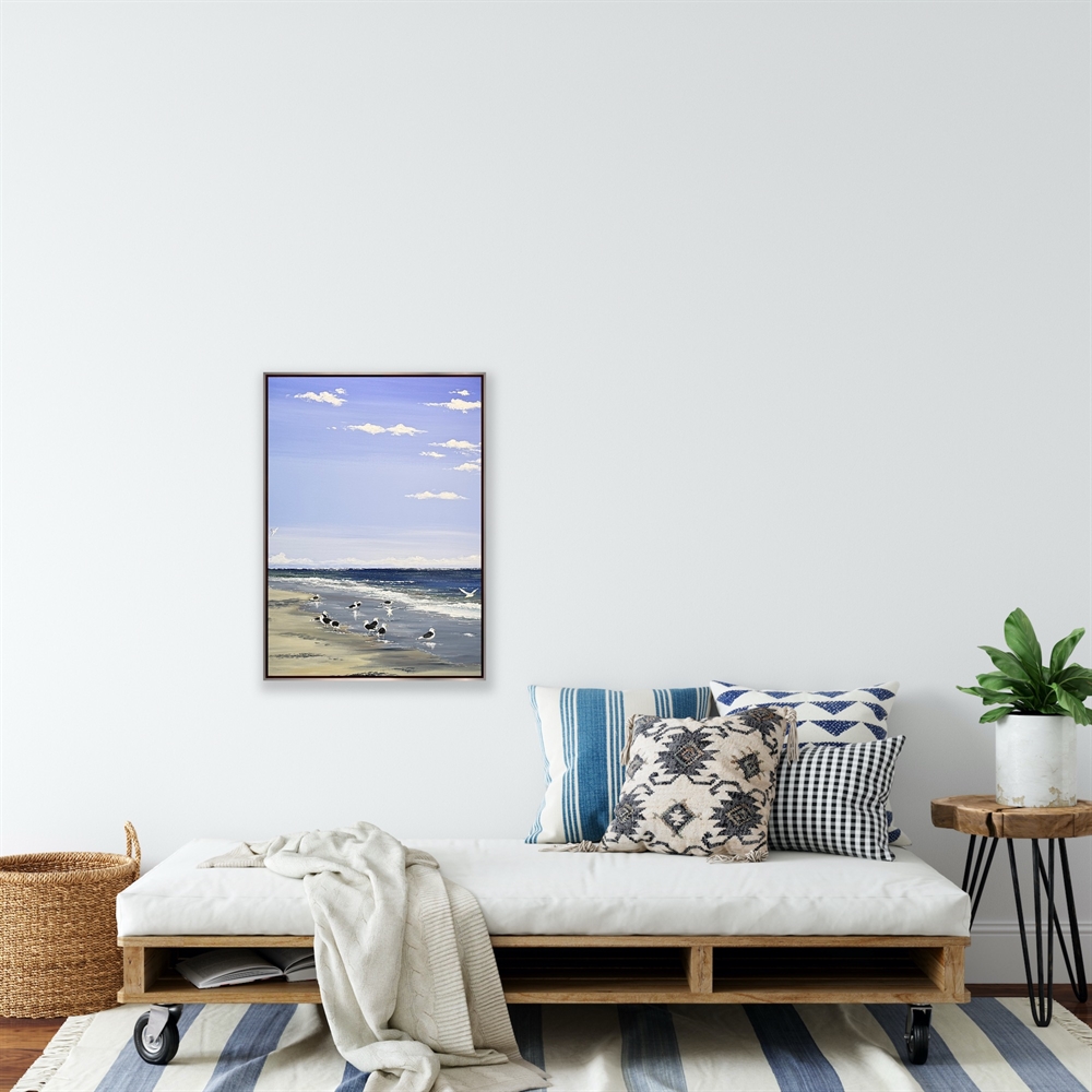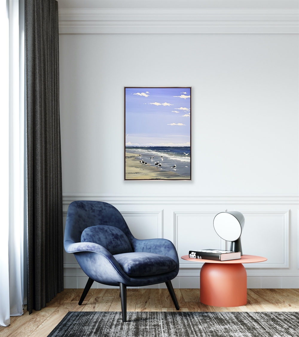 Motivet rummer en sart ro, hvor fuglenes ynde møder havets rytme i et harmonisk øjeblik.
